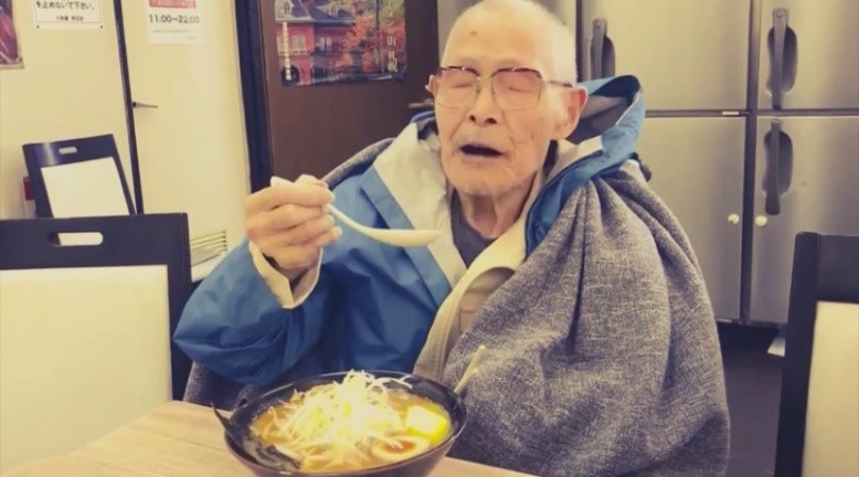 - 深夜にラーメンを美味しそうに食べる角さん