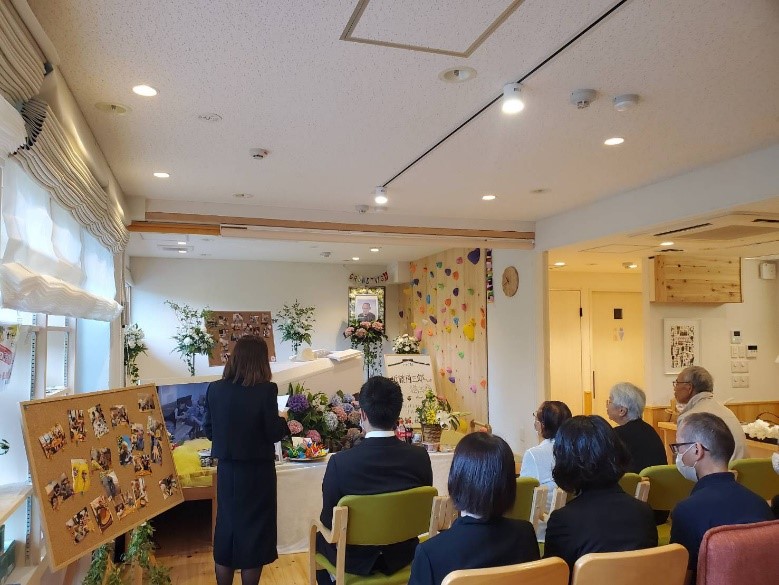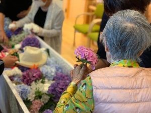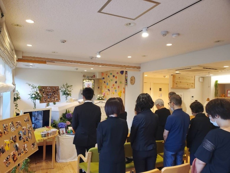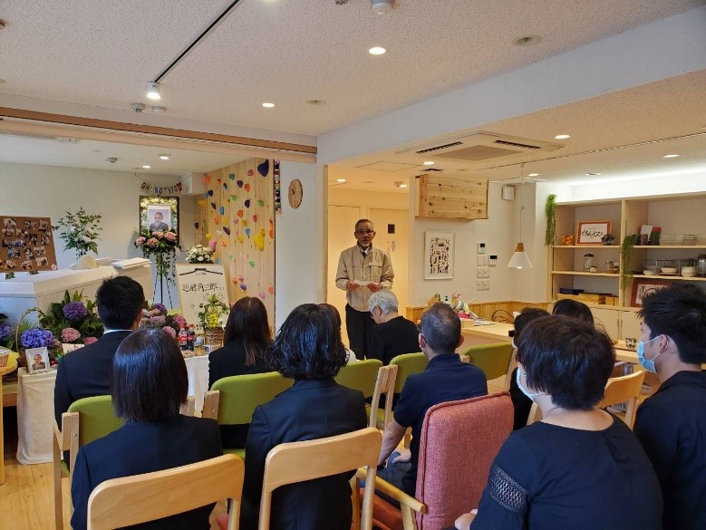 葬儀当日は、ご近所さん、子供も、ぐるんとびーの利用者さん、沢山の人に囲まれて、笑あり、涙ありの葬儀でした。私たちスタッフにとっても、ちゃんとお別れができたことで、心のケアができたと思います。